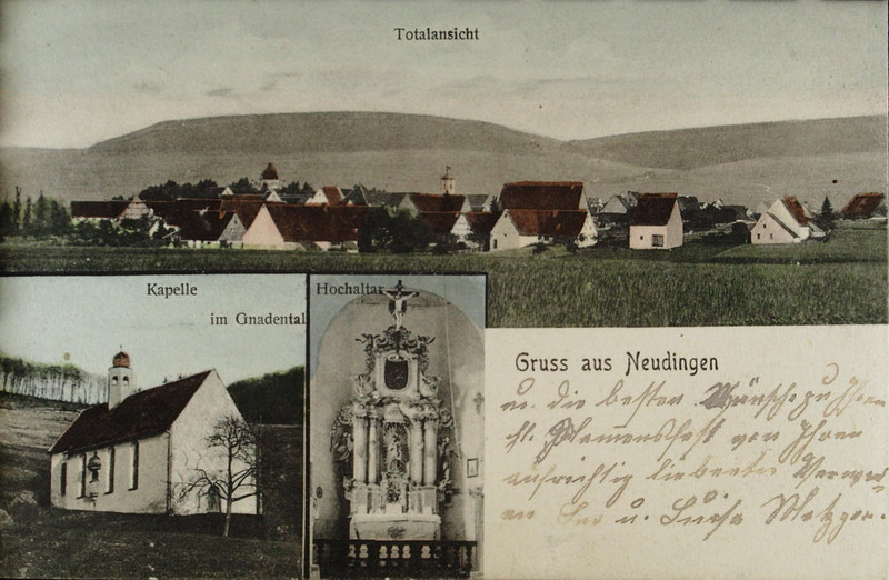 Der Förderverein zur Erhaltung der Gnadentalkapelle hat zwei historische Postkartenmotive um 1900 von Neudingen und der Gnadentalkapelle aus der Sammlung von Willi Hönle (Baarverein Donaueschingen e.V.) ausfindig gemacht.